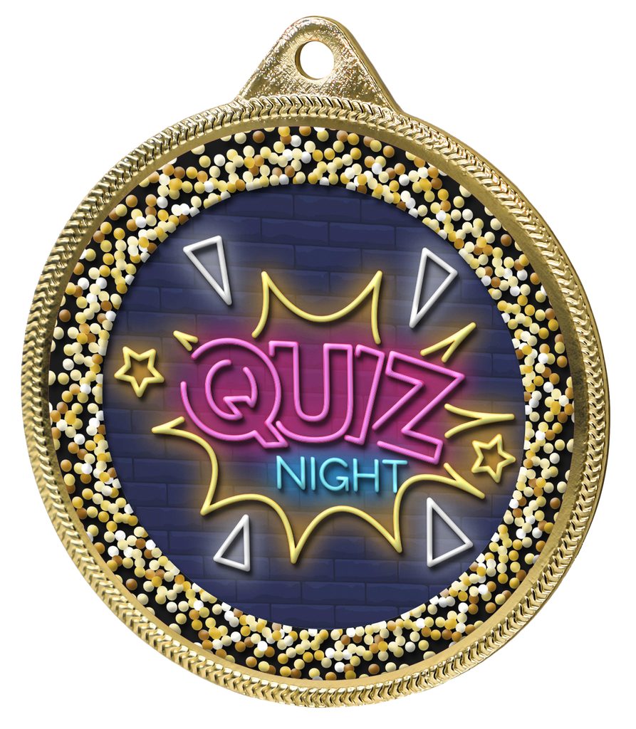 A truly superb new Quiz Night 2 1/8" medal made from iron. The medal has been printed using the latest 3D texture coating making the medal come alive with a vibrant raised full color print. Give your next presentation a lift with these contemporary medals which are sure to make eyes light up when received!