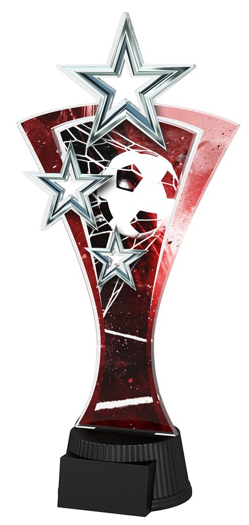 The Red and Silver Triple Star Soccer Trophy is a fantastic eye-catching award. With superb shape this trophy comes to life with a high quality full colour print on 1/4" thick acrylic mounted on a black PVC base, with a triple star design taking centre stage on the trophy.
