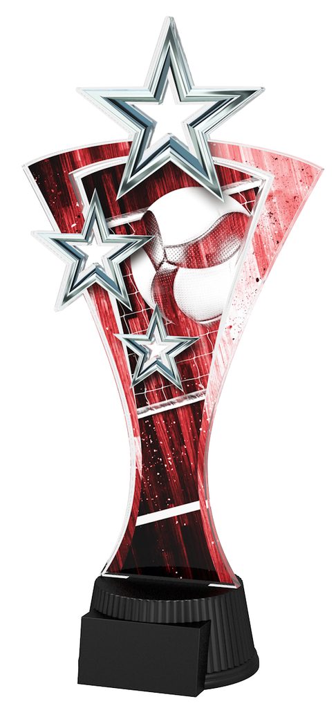 The Red and Silver Triple Star Volleyball Trophy is a fantastic eye-catching award. With superb shape this trophy comes to life with a high quality full colour print on 1/4" thick acrylic mounted on a black PVC base, with a triple star design taking centre stage on the trophy.