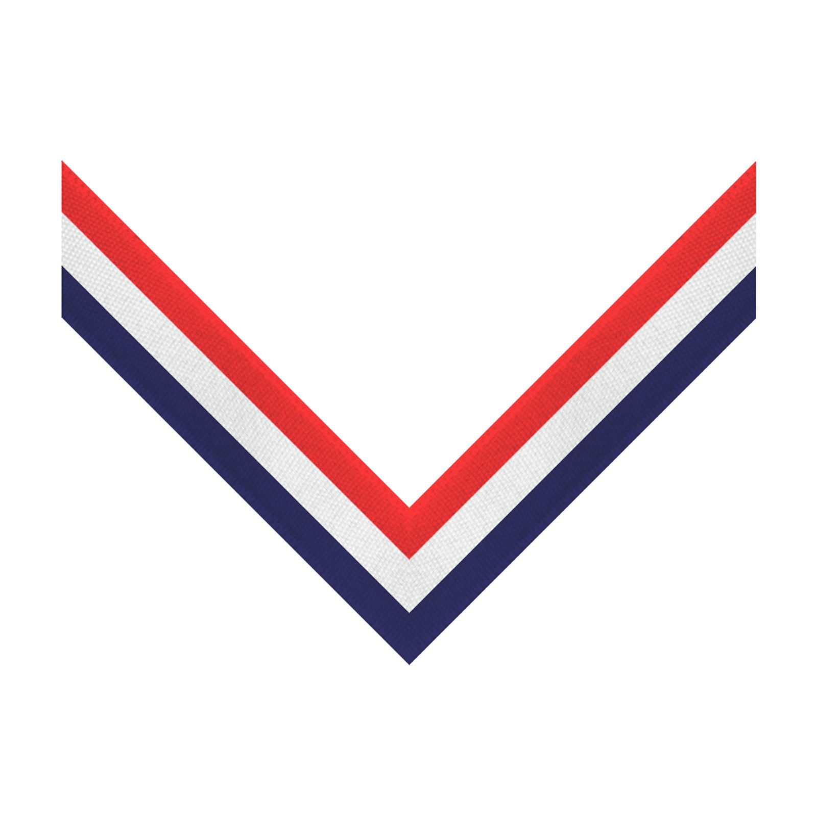 A three colour red, white and blue striped woven medal ribbon. All ribbons are finished with a ring and clip. The size is industry standard 22mm (wide) x 395mm (length) which will fit children and adults.