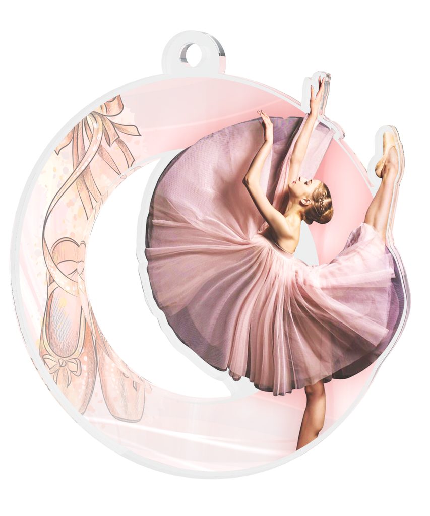 The Rio Ballet Medal is made from 1/8" thick acrylic with a very high quality reverse full color print. Expertly cut out in the middle making for a unique style medal. Select form three sizes. The medal comes complete with a loop to accommodate a ribbon.