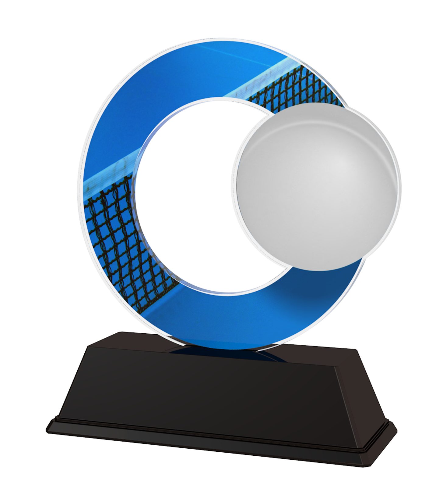 The Rio Blue Table Tennis Trophy is a vibrant low cost award with cutting edge design. Cut out to shape this trophy features a high quality full color print on the reverse side of the 5/32" thick acrylic mounted on a black PVC base.