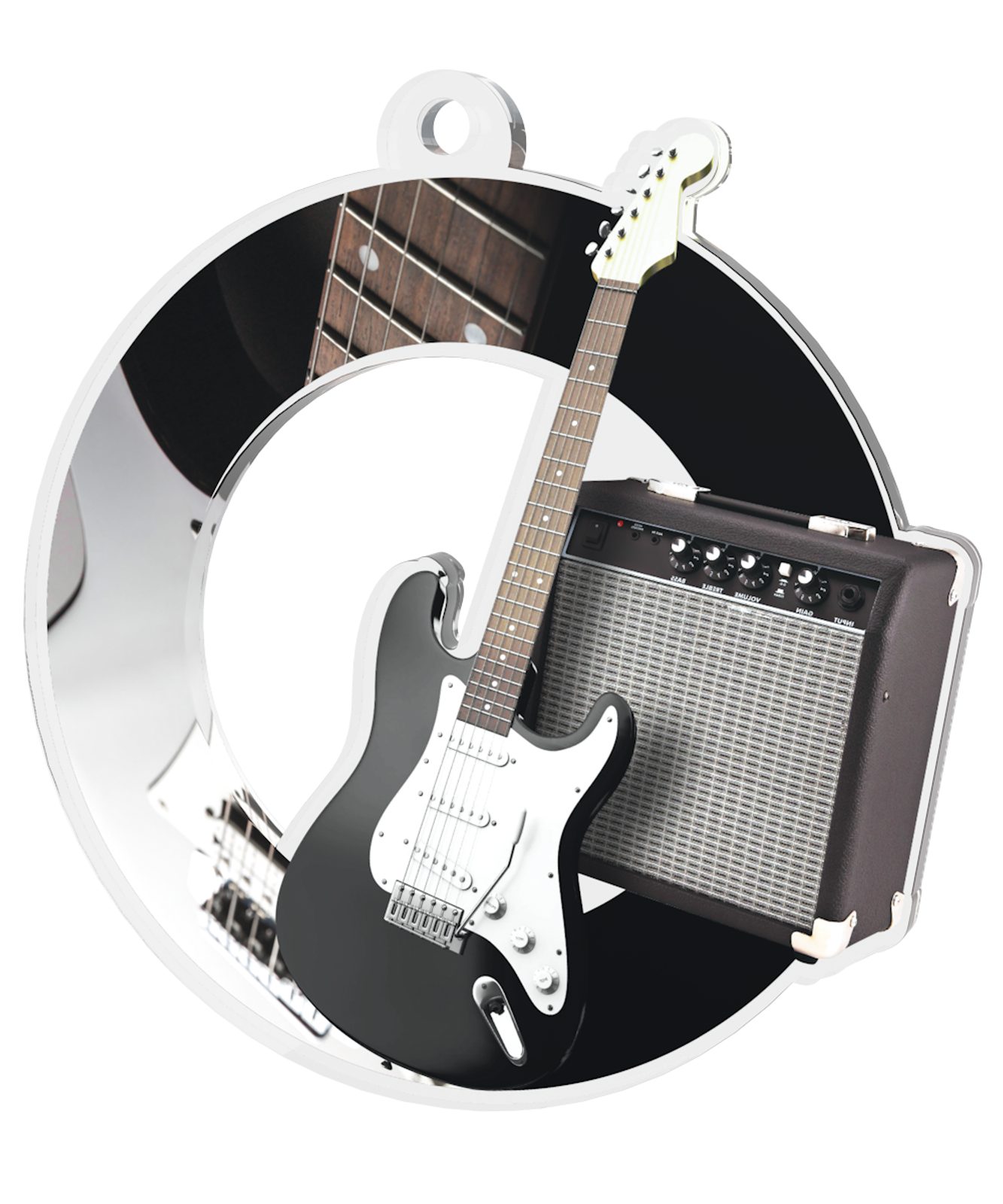 The Rio Electric Guitar Medal is made from 1/8"  thick acrylic with a very high quality reverse full color print. Expertly cut out in the middle making for a unique style medal. Select form three sizes. The medal comes complete with a loop to accommodate a ribbon.
