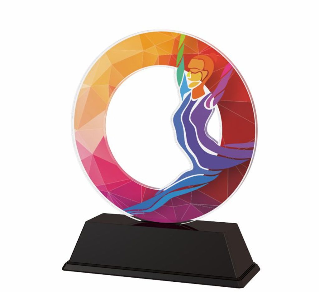 The Rio Gymnastics Arts Trophy Trophy is a vibrant low cost award with cutting edge design. Cut out to shape this trophy features a high quality full color print on the reverse side of the 5\32" thick acrylic mounted on a black PVC base.
