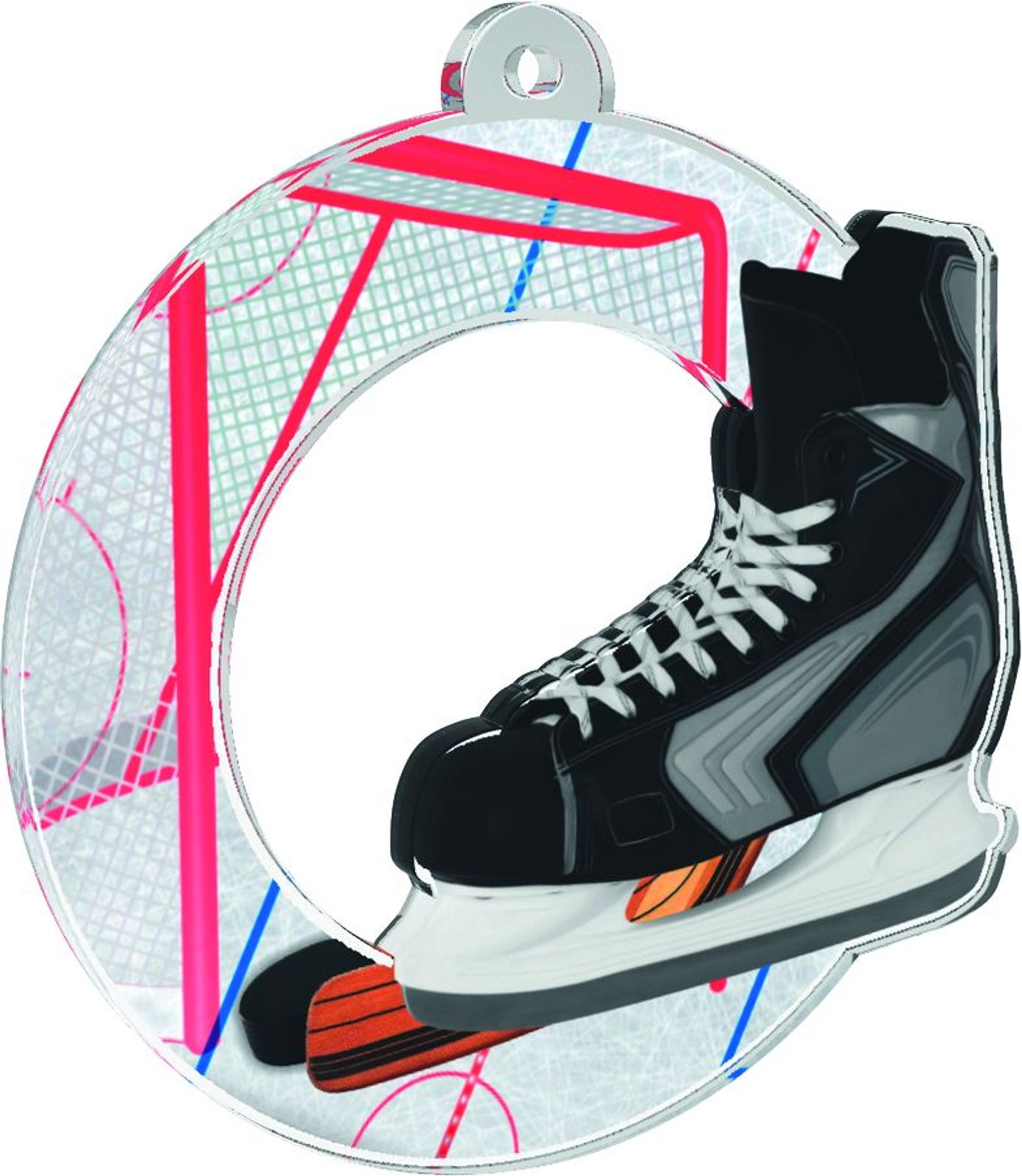 The Rio Ice Hockey Medal is made from 1/8" thick acrylic with a very high quality reverse full color print. Expertly cut out in the middle making for a unique style medal. Select form three sizes. The medal comes complete with a loop to accommodate a ribbon.