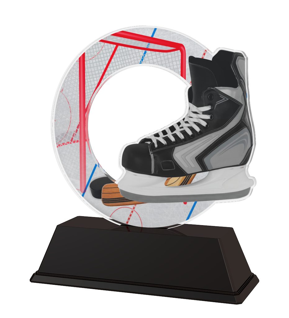 The Rio Ice Hockey Trophy is a vibrant low cost award with cutting edge design. Cut out to shape this trophy features a high quality full color print on the reverse side of the 5/32" thick acrylic mounted on a black PVC base.