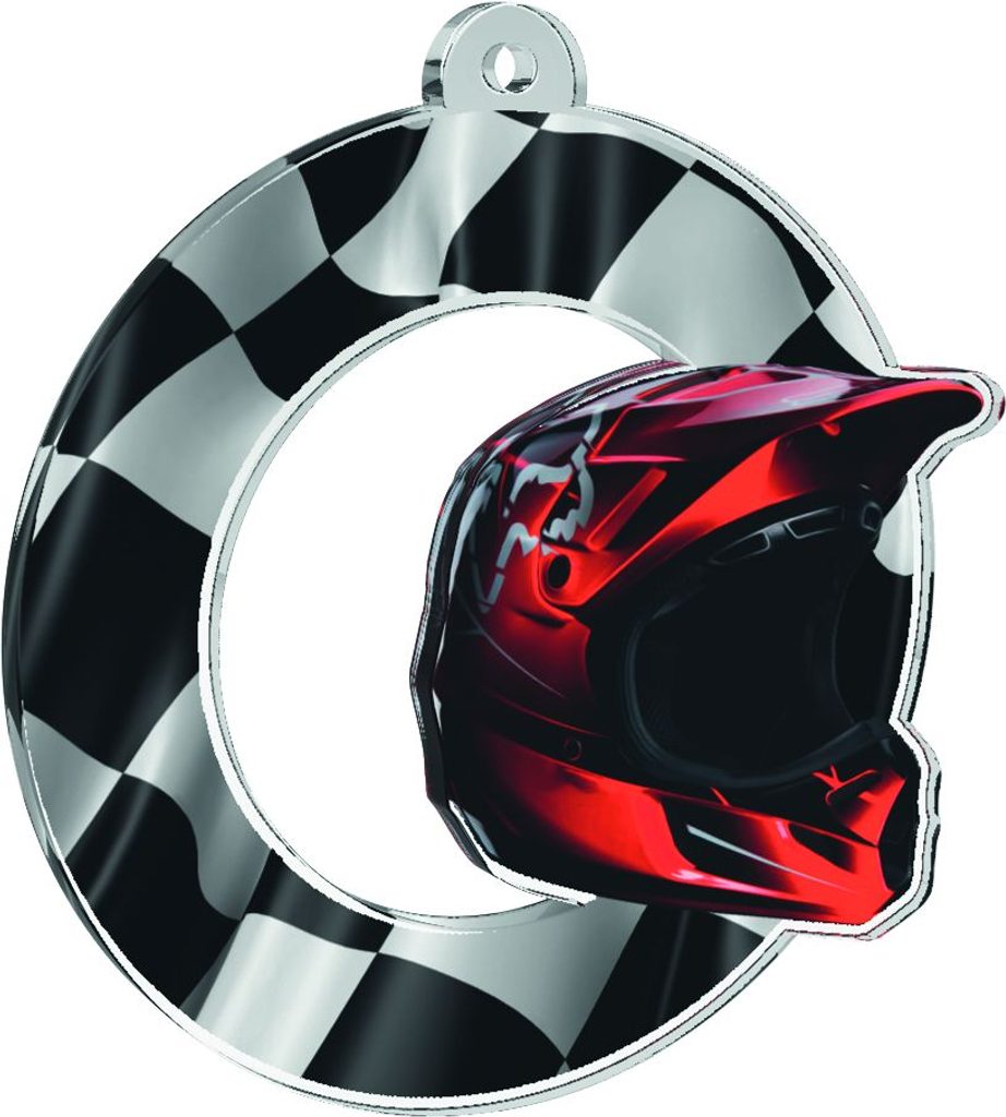The Rio Motorbike Helmet Medal is made from 1/8" thick acrylic with a very high quality reverse full color print. Expertly cut out in the middle making for a unique style medal. Select form three sizes. The medal comes complete with a loop to accommodate a ribbon.