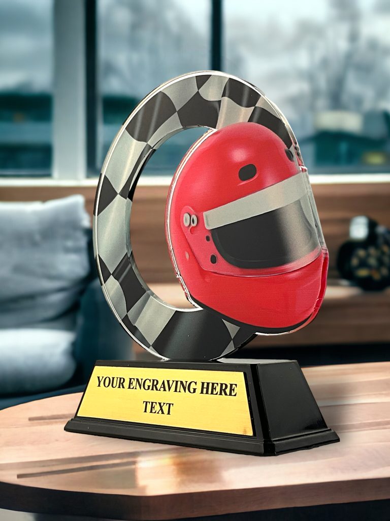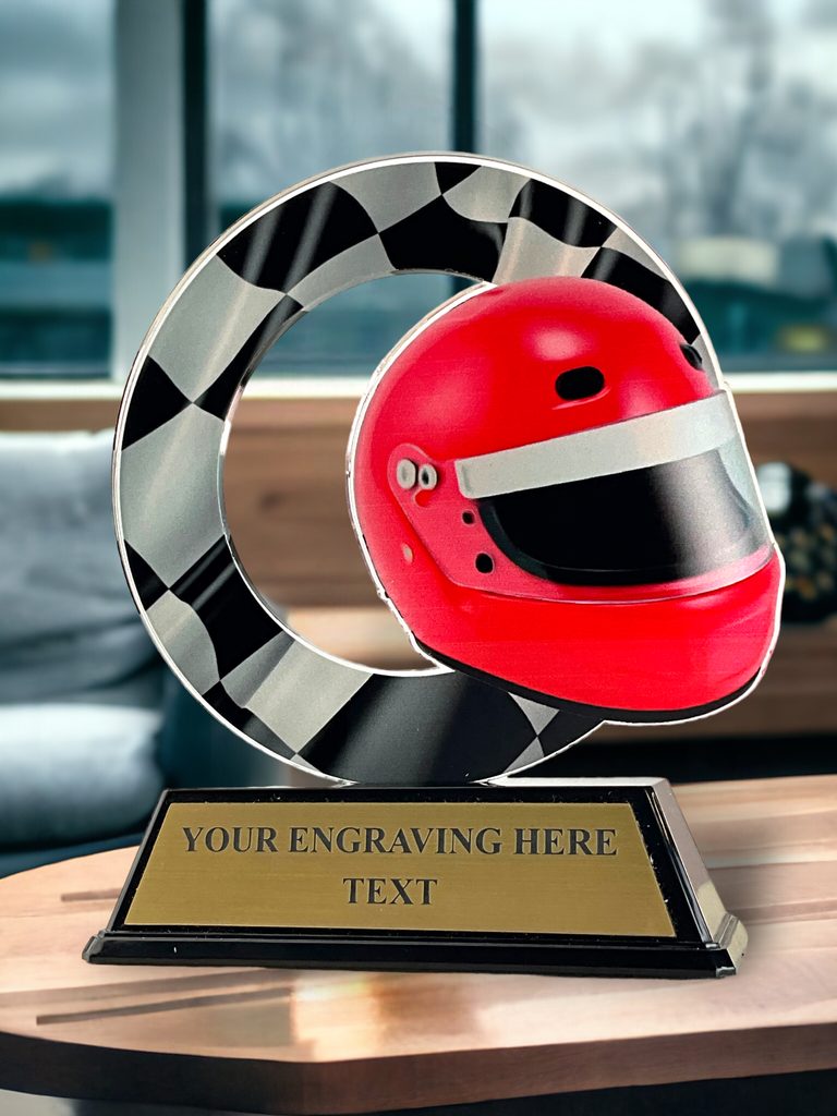 The Rio Motorsports Helmet Trophy is a vibrant low cost award with cutting edge design. Cut out to shape this trophy features a high quality full color print on the reverse side of the 5/32" thick acrylic mounted on a black PVC base.