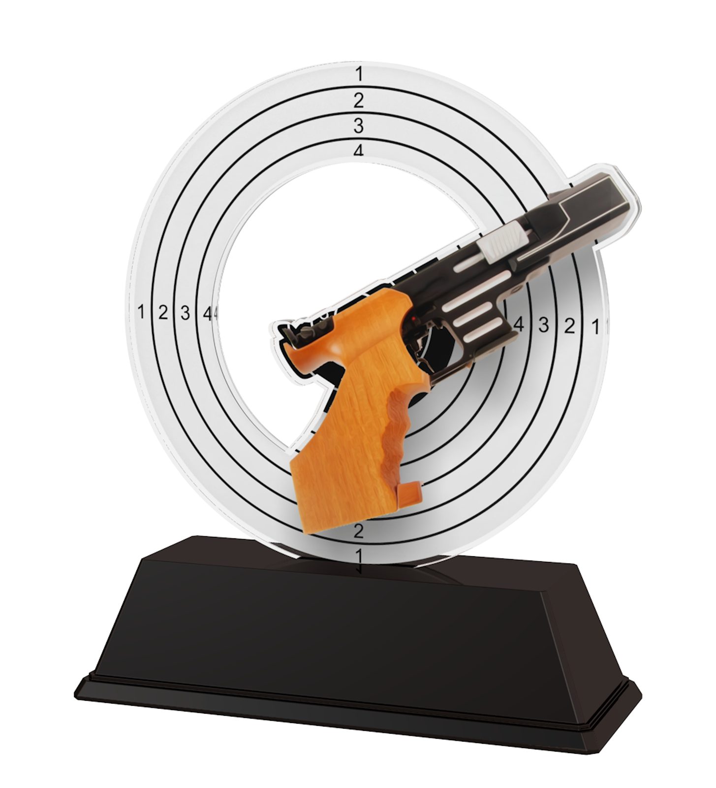 The Rio Pistol Shooting Trophy is a vibrant low cost award with cutting edge design. Cut out to shape this trophy features a high quality full color print on the reverse side of the 5/32" thick acrylic mounted on a black PVC base.
