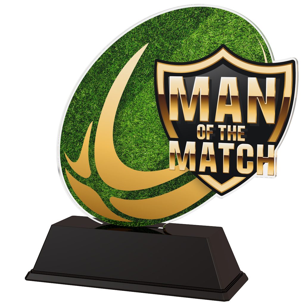 The Rio Rugby Man of the Match Trophy is a vibrant low cost award with cutting edge design. Cut out to shape this trophy features a high quality full color print on the reverse side of the 5/32" thick acrylic mounted on a black PVC base.