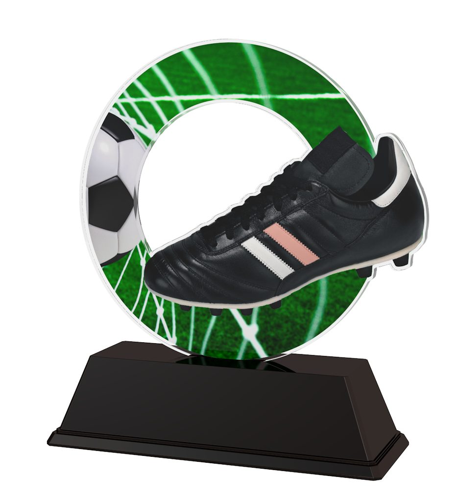 The Rio Soccer Boot Trophy is a vibrant low cost award with cutting edge design. Cut out to shape this trophy features a high quality full color print on the reverse side of the 5\32" thick acrylic mounted on a black PVC base.