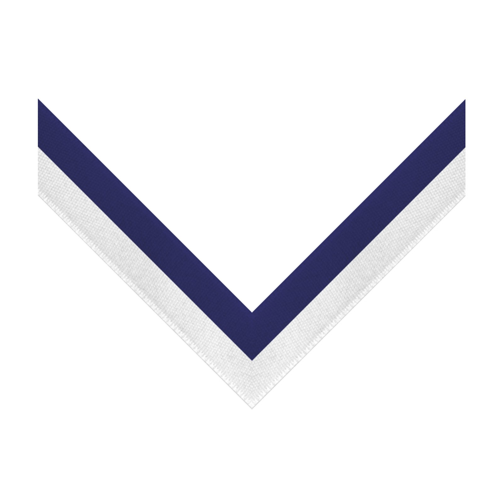 A two colour royal blue and white striped woven medal ribbon. All ribbons are finished with a ring and clip. The size is industry standard 22mm (wide) x 395mm (length) which will fit children and adults.