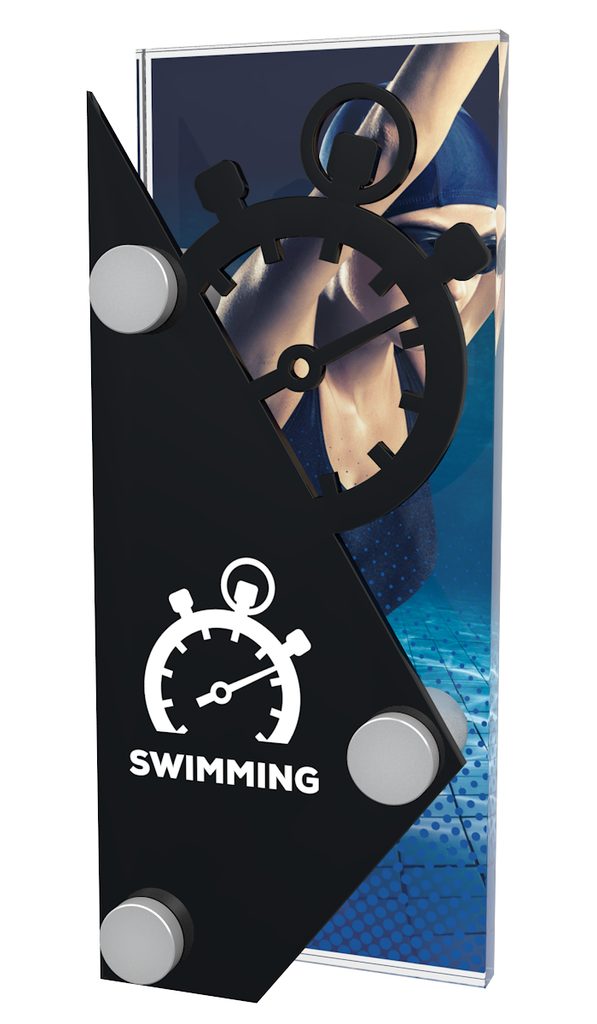 The Salzburg Female Swimmer Trophy is made from two pieces of acrylic. These are connected by using three steel screw fittings. The back piece is a 3/8"thick piece of high quality printed acrylic, and the front piece is laser cut black acrylic.