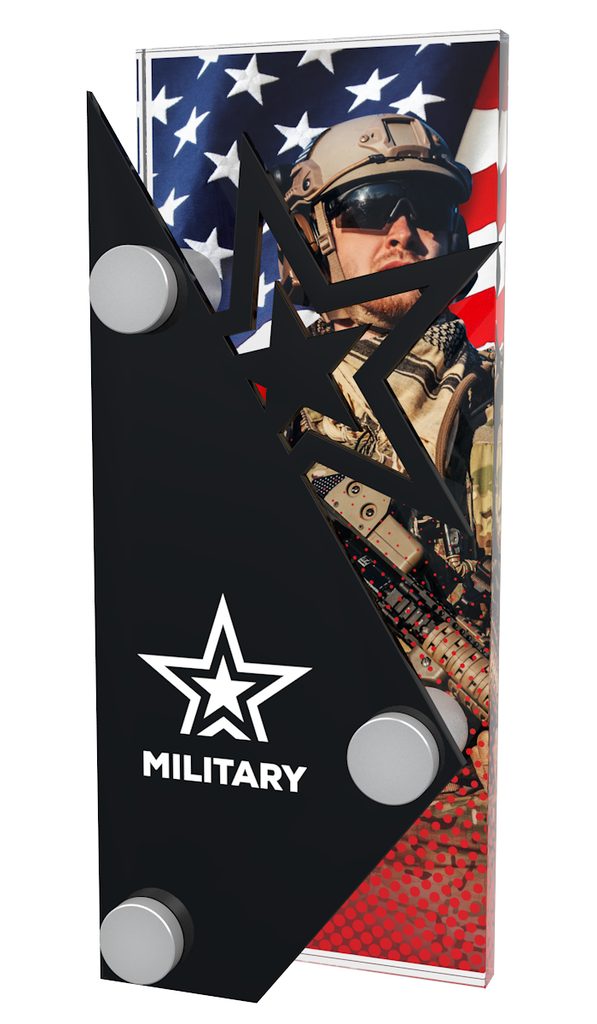 The Salzburg Soldier Military Trophy is made from two pieces of acrylic. These are connected by using three steel screw fittings. The back piece is a 3/8"thick piece of high quality printed acrylic, and the front piece is laser cut black acrylic.