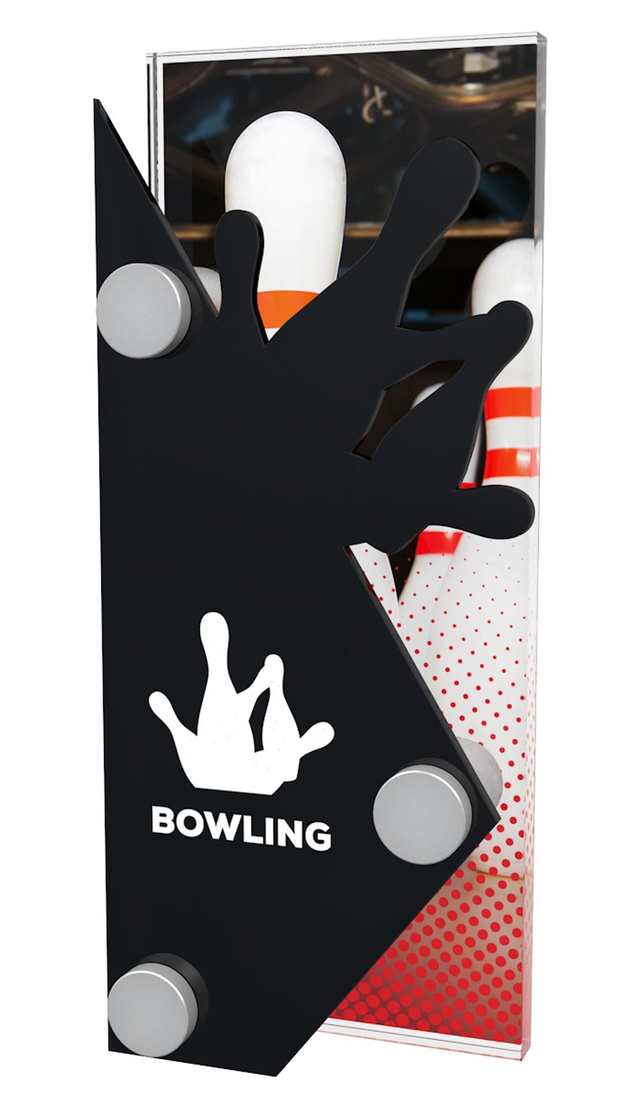 The Salzburg Bowling Trophy is made from two pieces of acrylic. These are connected by using three steel screw fittings. The back piece is a 3/8"thick piece of high quality printed acrylic, and the front piece is laser cut black acrylic.