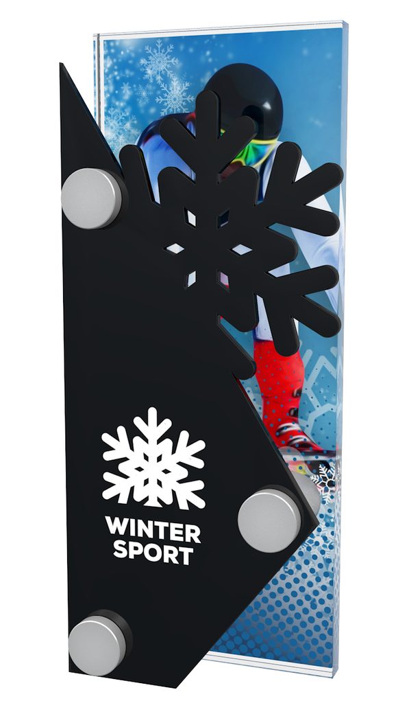 The Salzburg Winter Sports Trophy is made from two pieces of acrylic. These are connected by using three steel screw fittings. The back piece is a 3/8"thick piece of high quality printed acrylic, and the front piece is laser cut black acrylic.