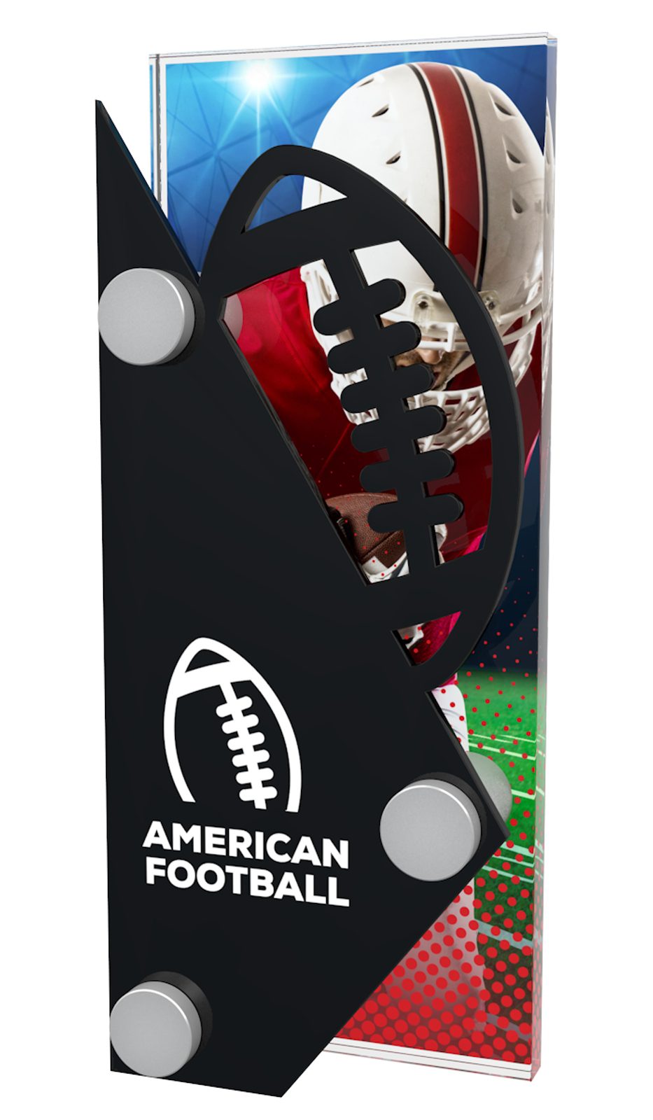 The San Diego American Football Trophy is made from two pieces of acrylic. These are connected by using three steel screw fittings. The back piece is a 10mm thick piece of high quality printed acrylic, and the front piece is laser cut black acrylic.