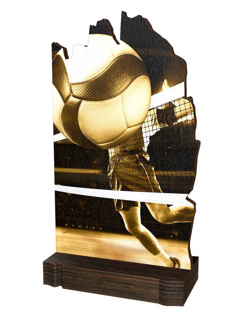 The Shard Classic Volleyball Eco Friendly Wooden Trophy is made from 1/2"  thick natural birch plywood, mounted on a 25/32" thick black wooden base. A sustainable award that is part of a collection designed and manufactured in our own factory. Not only for the environmentally conscious, this trophy will prove popular in any presentation.