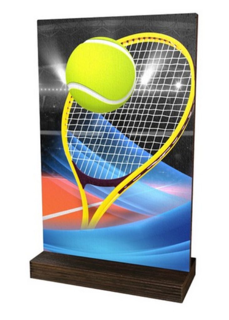 The Sherwood Tennis Eco Friendly Wooden Trophy is made from 1/2"  thick natural birch plywood, mounted on a 25/32" thick black wooden base. A sustainable award that is part of a collection designed and manufactured in our own factory. Not only for the environmentally conscious, this trophy will prove popular in any presentation.