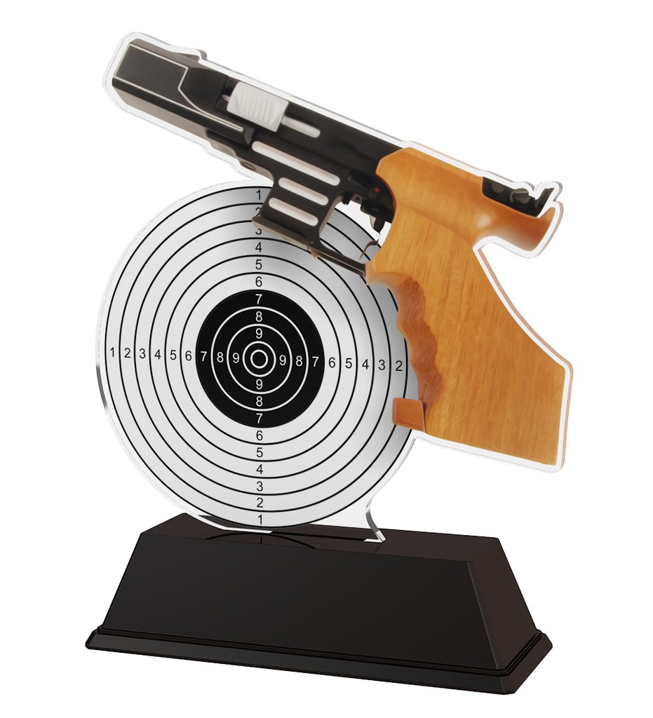 A contemporary designer Shooting Pistol trophy. Cut to shape this award comes to life with a high quality full color print on the reverse side of the 4mm thick acrylic mounted on a black PVC base. Comes in 4 sizes 4", 5 3/4", 6", 6 1/2".