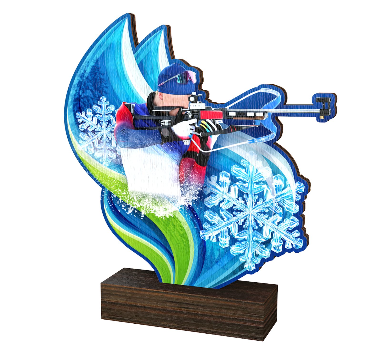 The Sierra Biathlon Real Wood Trophy  is a brand new eco friendly award made from 5/16" thick natural birch plywood, mounted on a thick wooden rectangular base. A sustainable product that is part of a collection designed and manufactured in our own factory. Not only for the environmentally conscious, this trophy will be the centrepiece in any presentation.