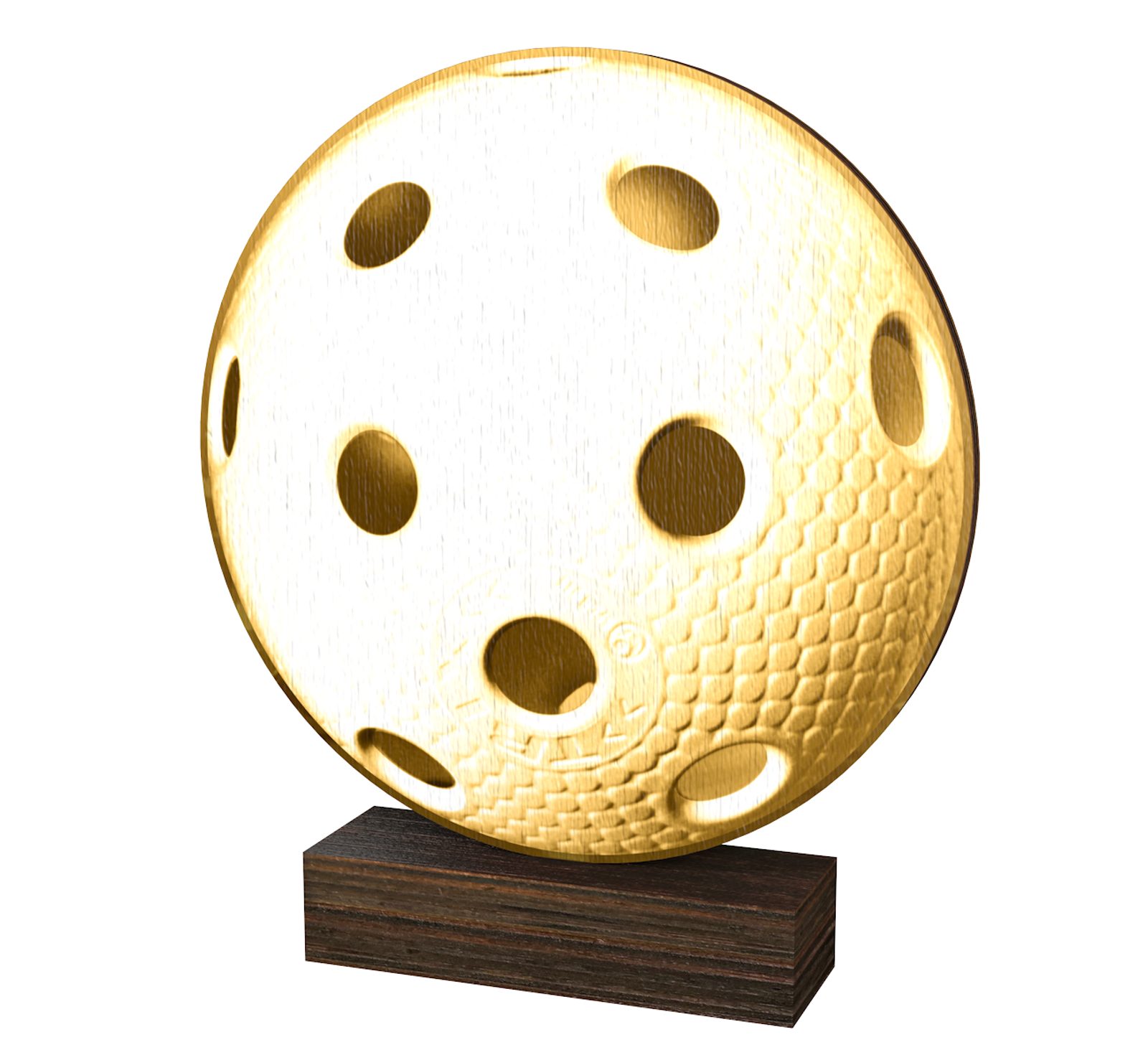 The Sierra Classic Floorball Ball Wood Trophy is a brand new eco friendly award made from 0.3" thick natural birch plywood, mounted on a thick wooden rectangular base. A sustainable product that is part of a collection designed and manufactured in our own factory. Not only for the environmentally conscious, this trophy will be the centrepiece in any presentation.