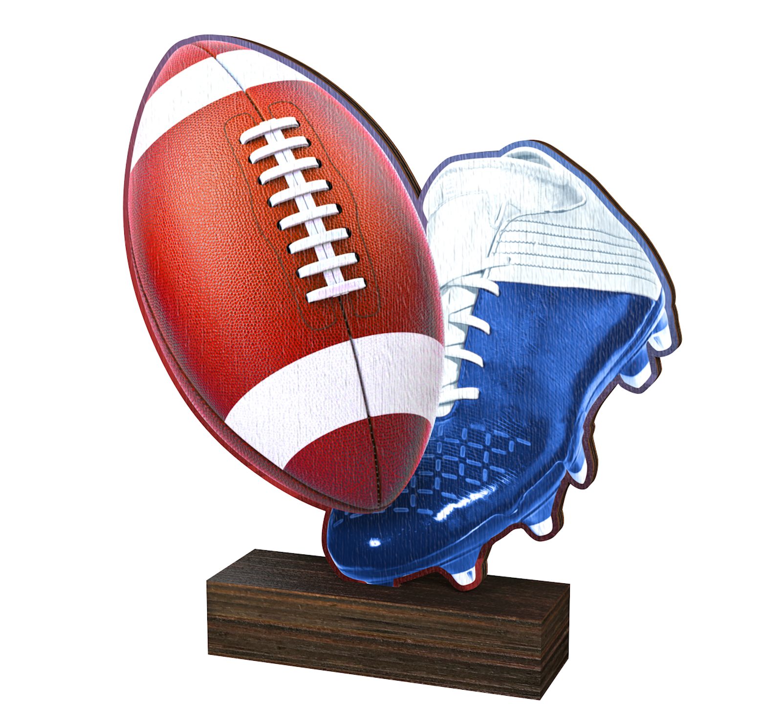 The Sierra Football Boot Real Wood Trophy is a brand new eco friendly award made from 0.3" thick natural birch plywood, mounted on a thick wooden rectangular base. A sustainable product that is part of a collection designed and manufactured in our own factory. Not only for the environmentally conscious, this trophy will be the centrepiece in any presentation.