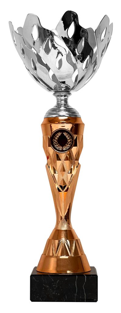 The Gold and Bronze Cup ECL2022/26 is an elegant trophy cup award. Made from a large laser cut metal bowl   mounted on a plastic column. The cup is then fixed to weighted marble base.  Select from 2 sizes.