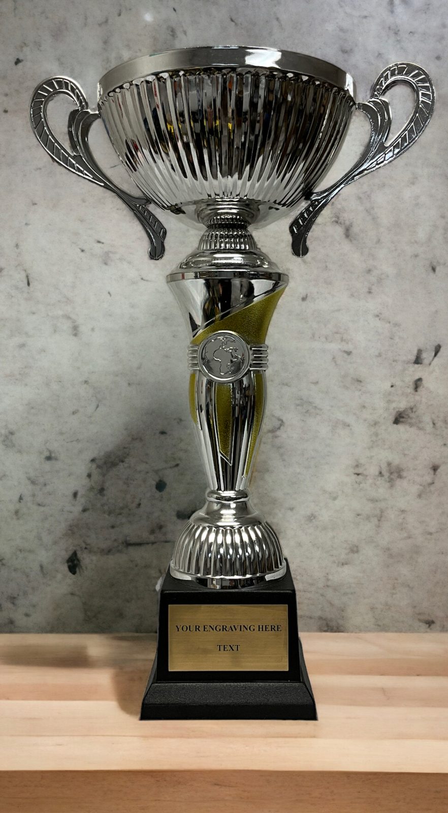 Silver and Gold Cup is an elegant trophy cup award. They are made from a large metal bowl with ornate handles mounted on a plastic column. The cup is then fixed to a weighted PVC base.  Select from 3 sizes.