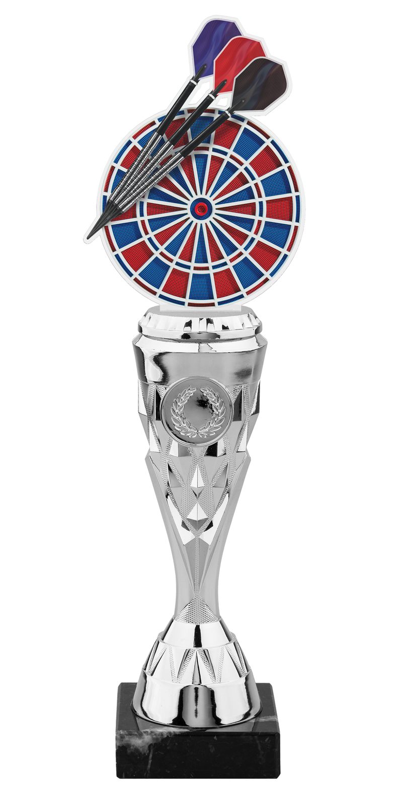 The Silver Darts Red & Blue Acrylic Top Trophy is the latest in contemporary design. Watch eyes light up when presenting this award, with the high quality full colour print on the reverse side of 4mm thick acrylic mounted on an attractive silver plastic column, which itself is mounted on a black marble base.