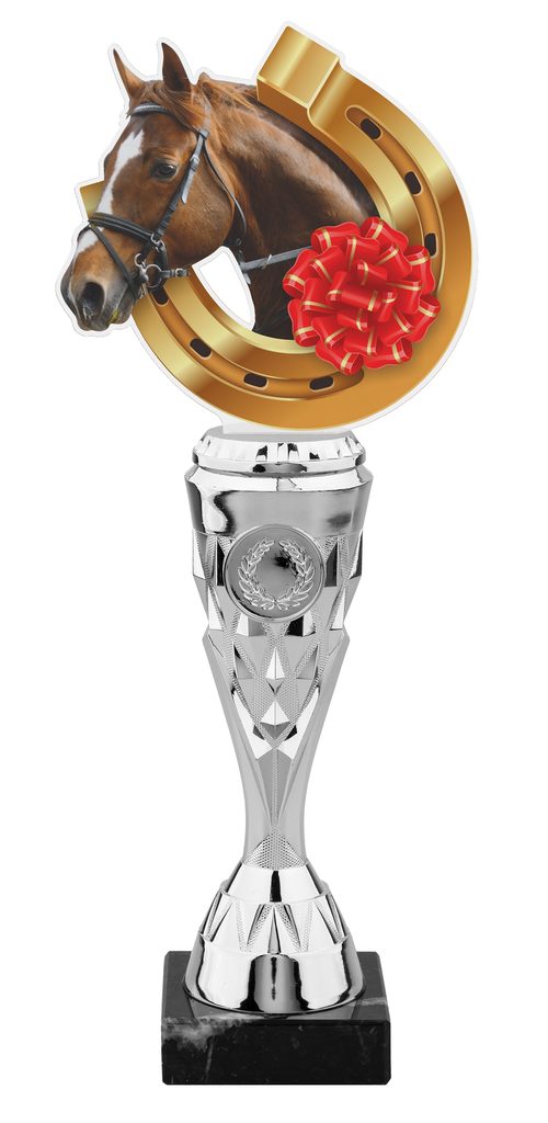 The Silver Horse Acrylic Top Trophy is the latest in contemporary design. Watch eyes light up when presenting this award, with the high quality full colour print on the reverse side of 4mm thick acrylic mounted on an attractive silver plastic column, which itself is mounted on a black marble base.