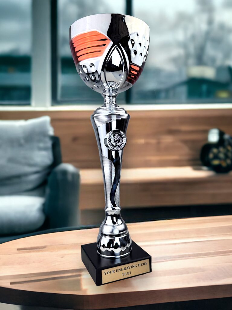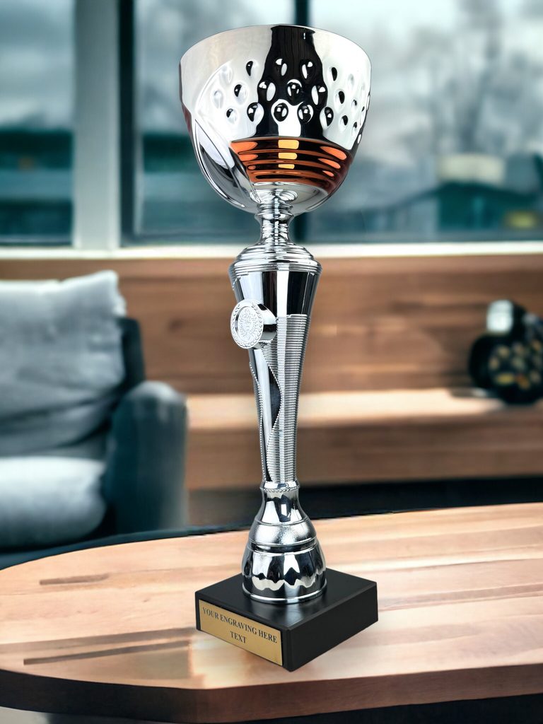 The STL2022/01 Silver and Copper Cup is an elegant trophy cup award. Made from a large metal bowl with ornate handles mounted on a plastic column. The cup is then fixed to weighted marble base.  Select from 3 sizes.