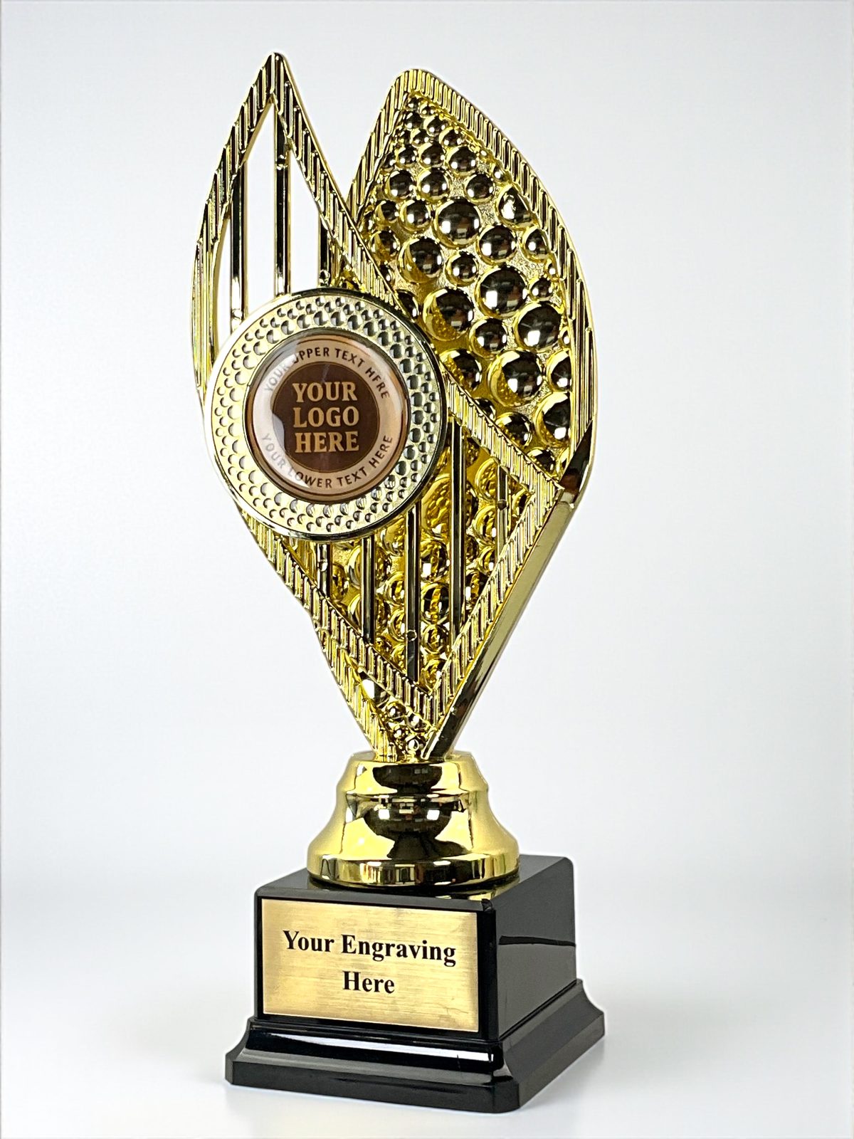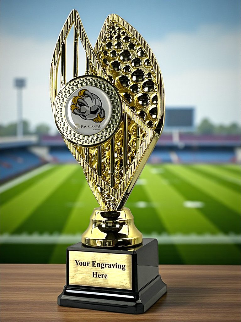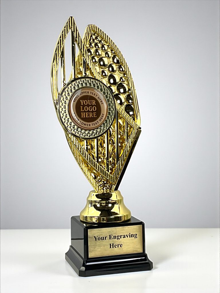 The Taft Trophy combines a modern golden design with a sleek black base and engraving plate. Made from durable plastic, it’s lightweight yet elegant, with a round center insert for your logo or custom design. Perfect for sports awards, school achievements, and corporate recognition.