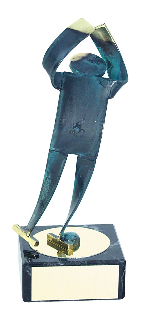The Toledo Ice Skating Trophy is an exclusive handmade metal award. This is then mounted onto a high quality black marble base. The award is part of an exclusive collection of awards that are handmade in Barcelona, Spain. Each trophy is hand crafted from high quality metals, including brass, copper, nickel, pewter and steel and are set upon either wooden or marble bases.