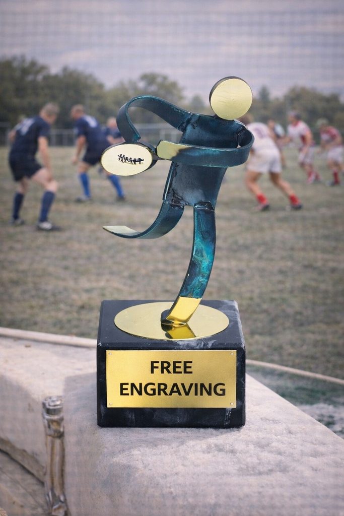 The Toledo Rugby Trophy is an exclusive handmade metal award. This is then mounted onto a high quality black marble base. The award is part of an exclusive collection of awards that are handmade in Barcelona, Spain. Each trophy is hand crafted from high quality metals, including brass, copper, nickel, pewter and steel and are set upon either wooden or marble bases.