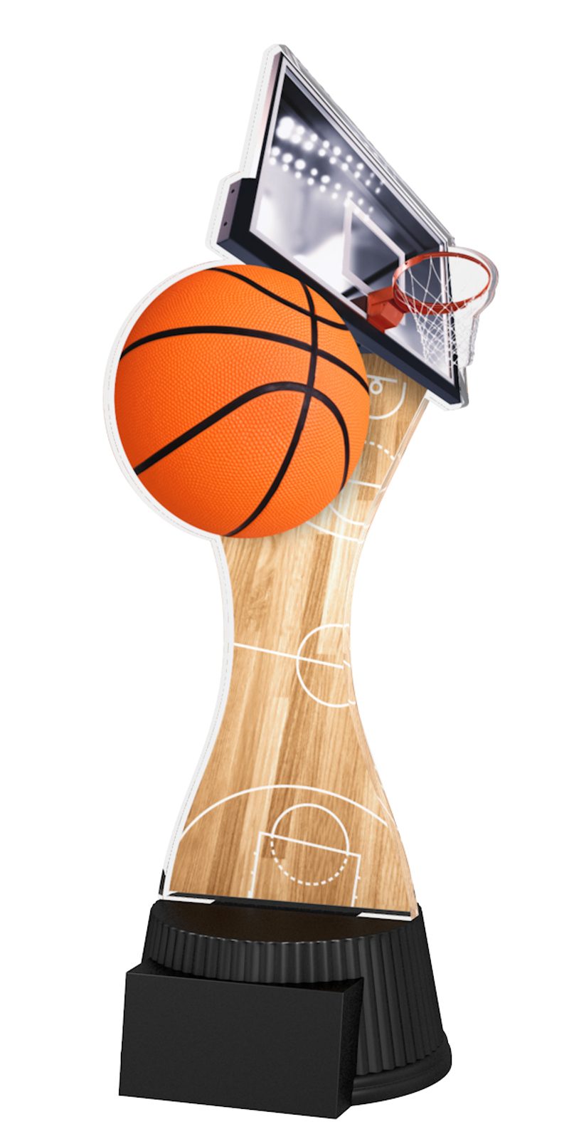 The Toronto Basketball Trophy is a modern style award. With superb shape this trophy comes to life with a high quality full colour double sided print on ¼" thick acrylic mounted on a black PVC base.