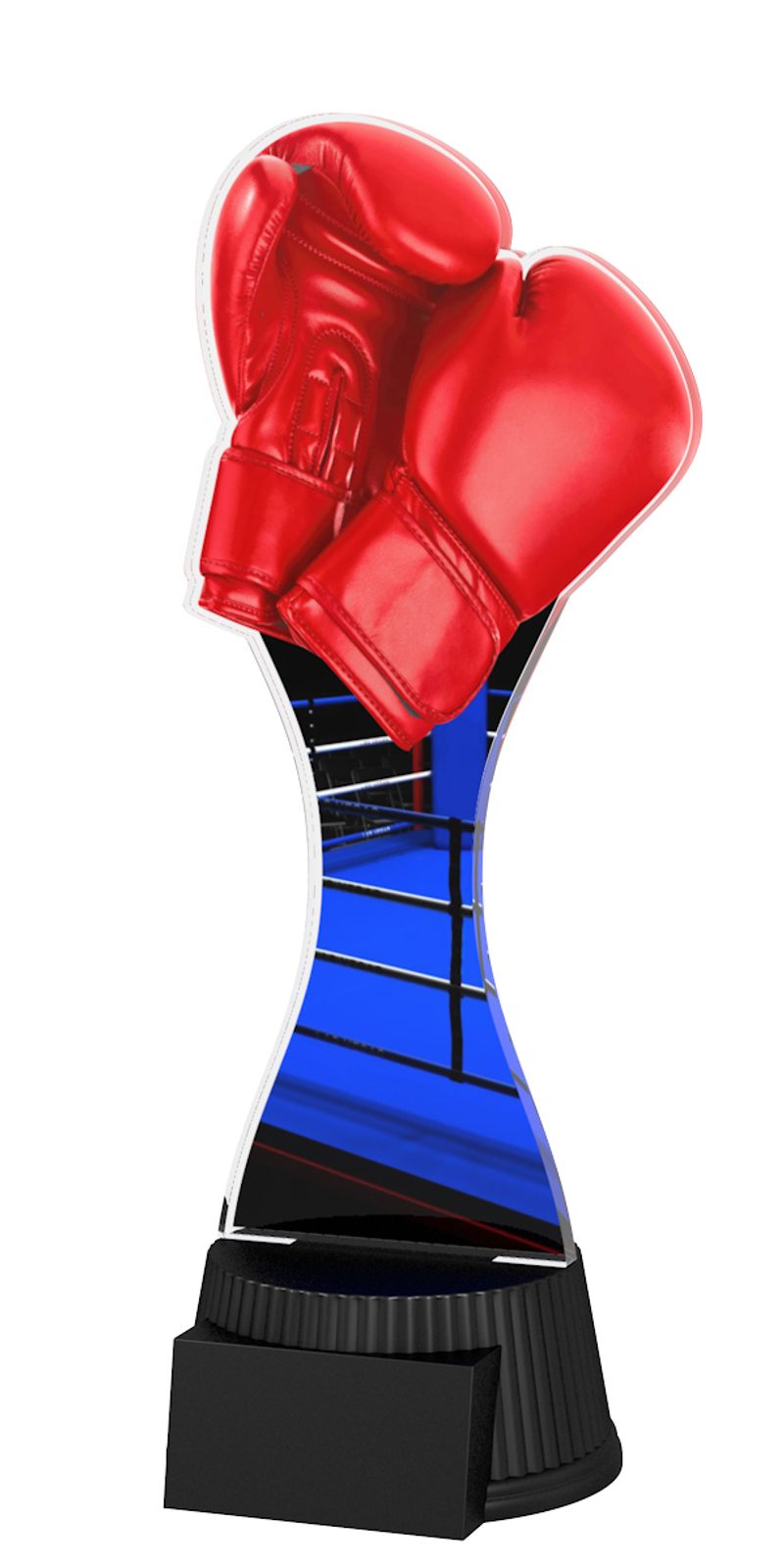 The Toronto Boxing Gloves Trophy is a modern style award. With superb shape this trophy comes to life with a high quality full colour double sided print on ¼" thick acrylic mounted on a black PVC base.