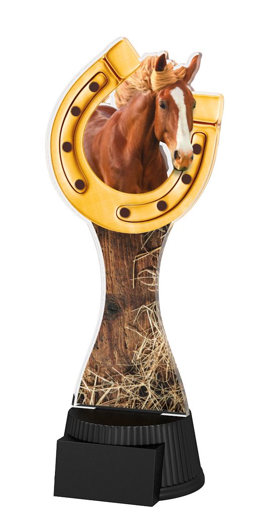 The Toronto Horse and Horseshoe Trophy is a modern style award. With superb shape this trophy comes to life with a high quality full colour double sided print on 1/4" thick acrylic mounted on a black PVC base.