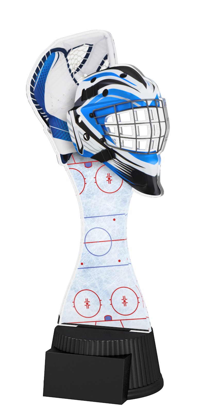The Toronto Ice Hockey Goalkeeper Trophy is a modern style award. With superb shape this trophy comes to life with a high quality full colour double sided print on 1/4" thick acrylic mounted on a black PVC base.