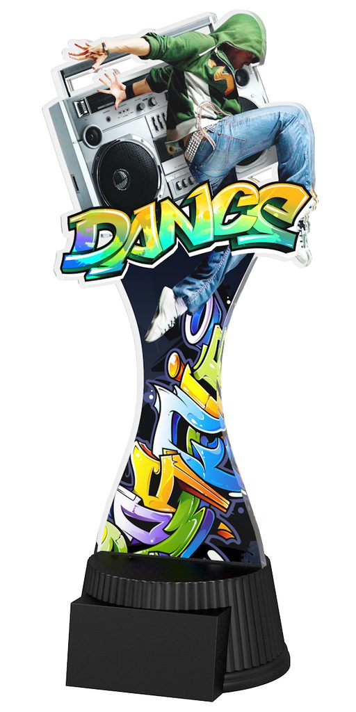 The Toronto Street Dance Trophy is a modern style award. With superb shape this trophy comes to life with a high quality full colour double sided print on 1/4" thick acrylic mounted on a black PVC base.
