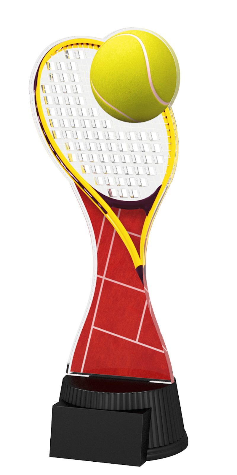 The Toronto Tennis Racket and Ball Trophy is a modern style award. With superb shape this trophy comes to life with a high quality full colour double sided print on ¼" thick acrylic mounted on a black PVC base.