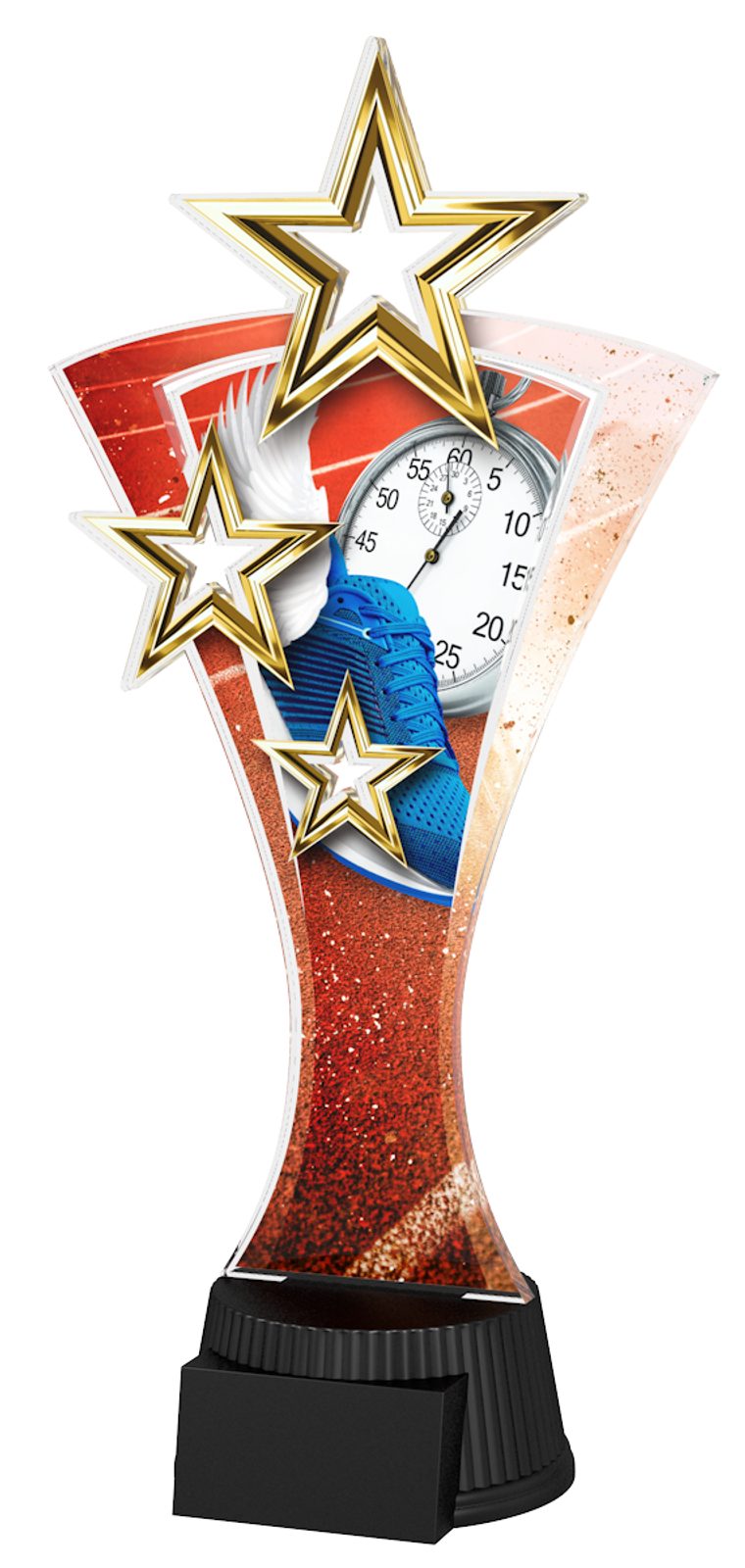 The Triple Star Athletics Trophy is a fantastic eye-catching award. With superb shape this trophy comes to life with a high quality full colour print on 1/4" thick acrylic mounted on a black PVC base, with a triple star design taking centre stage on the trophy.