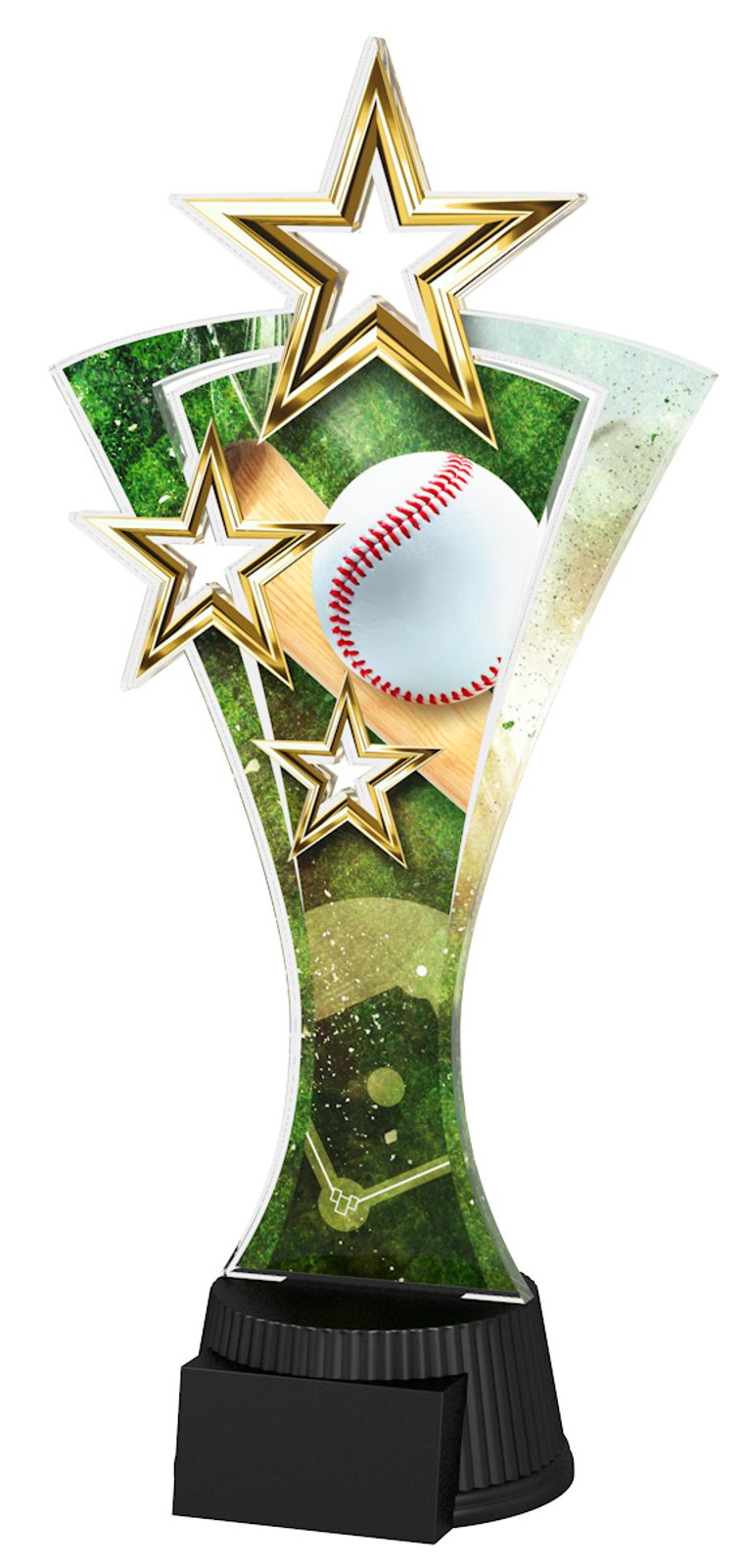 The Triple Star Baseball Trophy is a fantastic eye-catching award. With superb shape this trophy comes to life with a high quality full colour print on 1/4" thick acrylic mounted on a black PVC base, with a triple star design taking centre stage on the trophy.