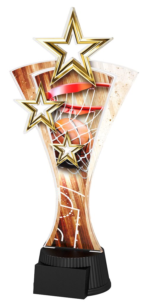 The Triple Star Basketball Trophy is a fantastic eye-catching award. With superb shape this trophy comes to life with a high quality full colour print on 1/4" thick acrylic mounted on a black PVC base, with a triple star design taking centre stage on the trophy.