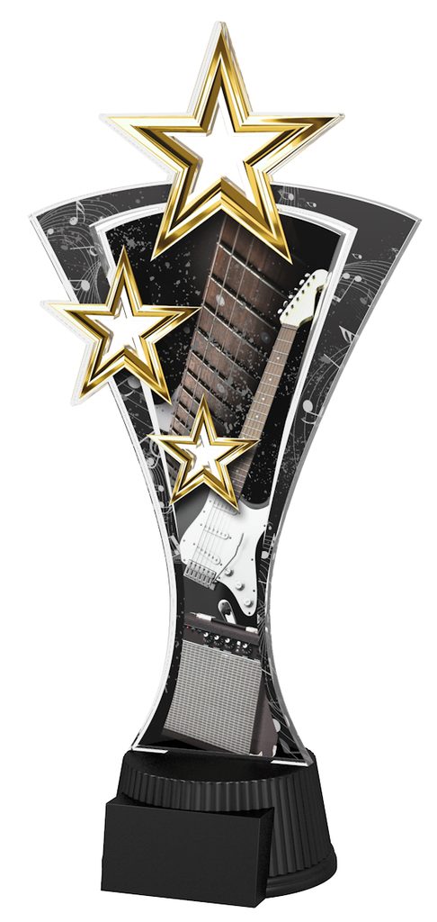 The Triple Star Electric Guitar Trophy is a fantastic eye-catching award. With superb shape this trophy comes to life with a high quality full colour print on 6mm thick acrylic mounted on a black PVC base, with a triple star design taking centre stage on the trophy.