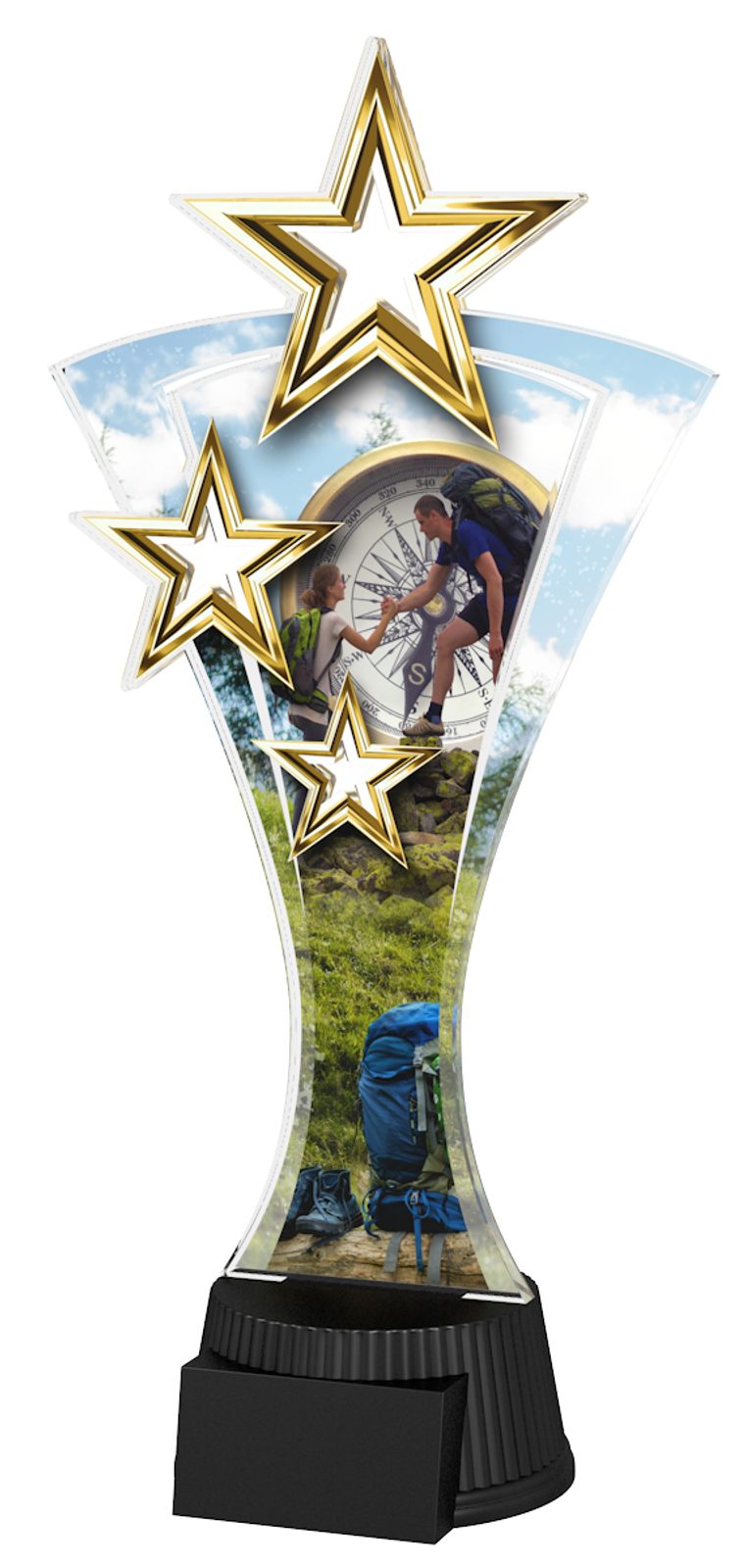 The Triple Star Hiking and Mountaineering Trophy is a fantastic eye-catching award. With superb shape this trophy comes to life with a high quality full colour print on 1/4" thick acrylic mounted on a black PVC base, with a triple star design taking centre stage on the trophy.