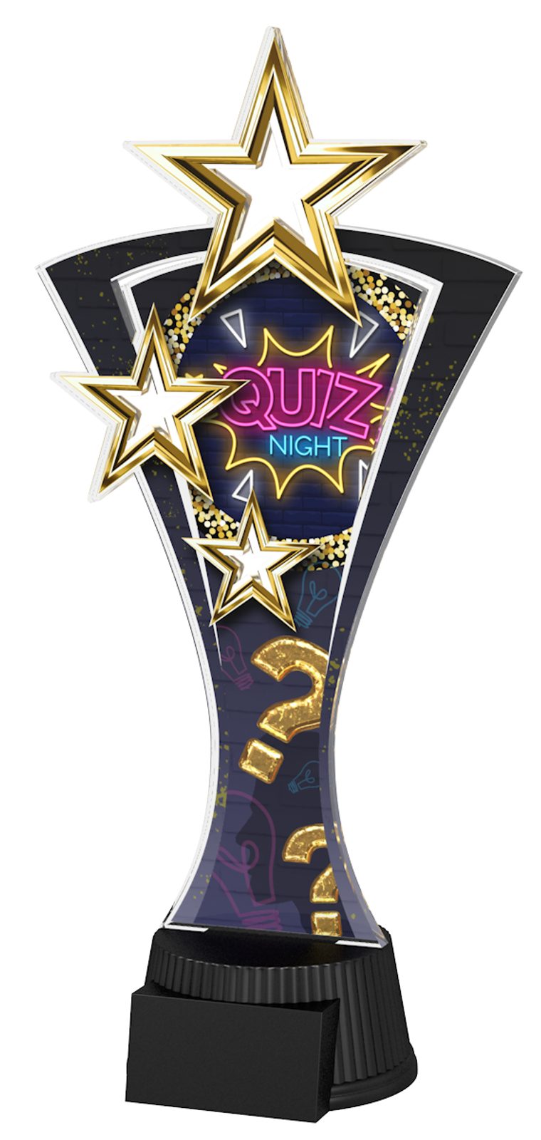 The Triple Star Quiz Night Trophy is a fantastic eye-catching award. With superb shape this trophy comes to life with a high quality full colour print on 1/4" thick acrylic mounted on a black PVC base, with a triple star design taking centre stage on the trophy.