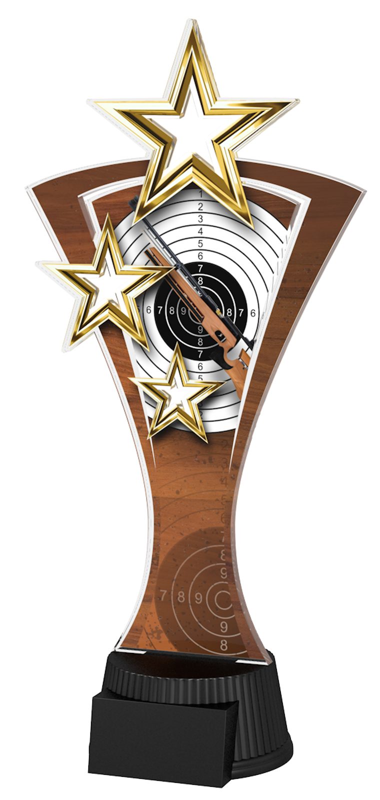 The Triple Star Rifle Shooting Trophy is a fantastic eye-catching award. With superb shape this trophy comes to life with a high quality full colour print on 1/4" thick acrylic mounted on a black PVC base, with a triple star design taking centre stage on the trophy.