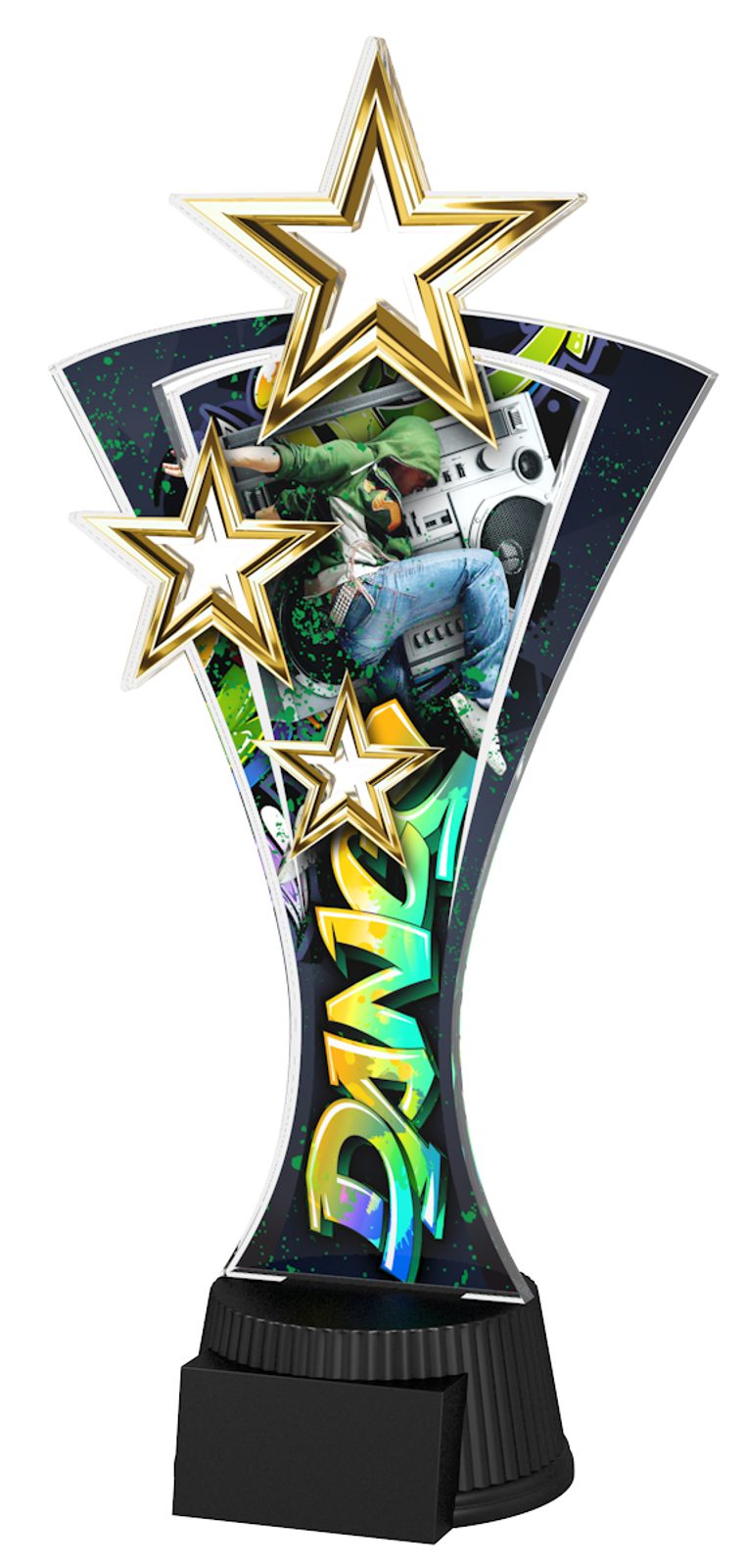 The Triple Star Street Dance Trophy is a fantastic eye-catching award. With superb shape this trophy comes to life with a high quality full colour print on 1/4" thick acrylic mounted on a black PVC base, with a triple star design taking centre stage on the trophy.