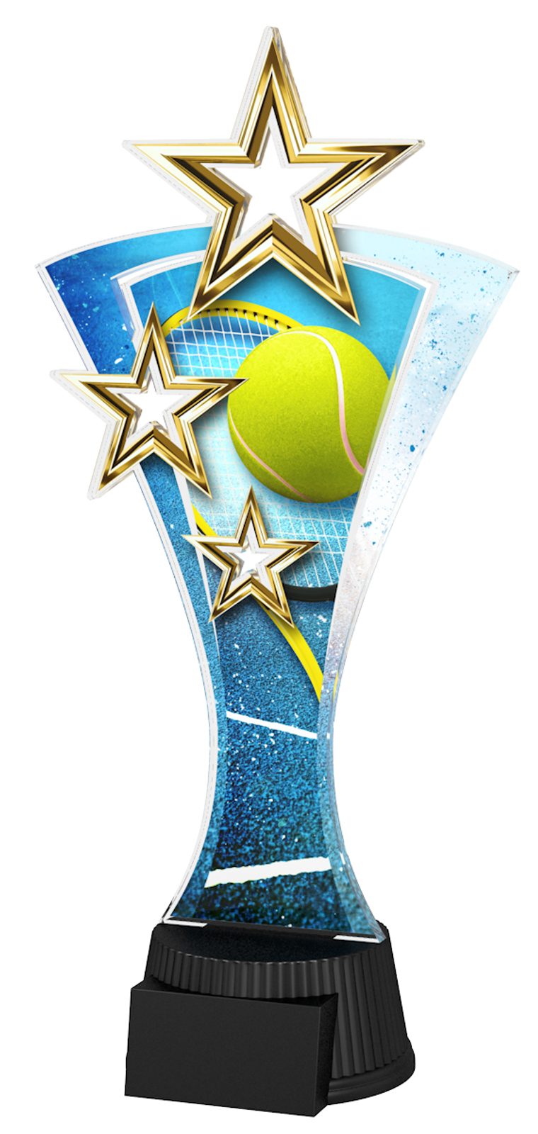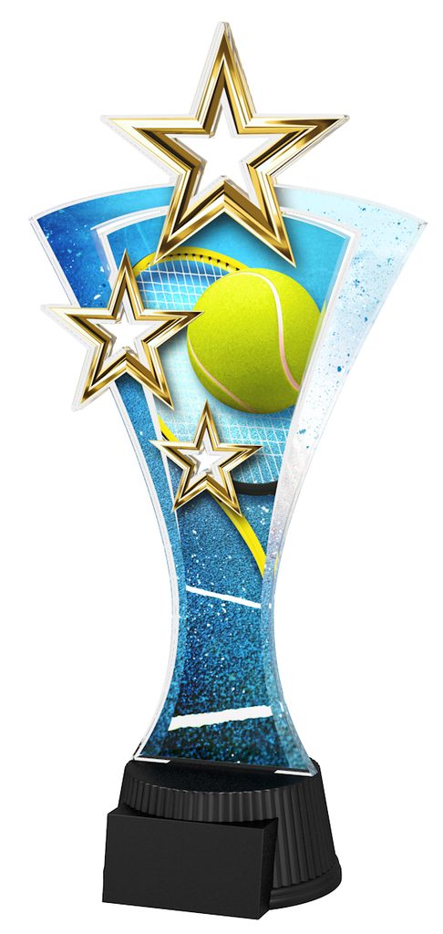 The Triple Star Tennis Trophy is a fantastic eye-catching award. With superb shape this trophy comes to life with a high quality full colour print on 1/4" thick acrylic mounted on a black PVC base, with a triple star design taking centre stage on the trophy.